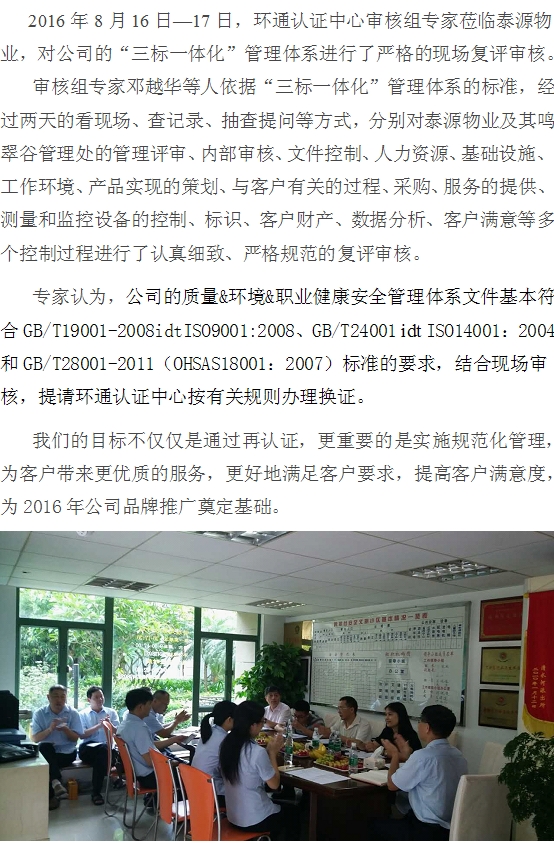泰源物業(yè)“三標(biāo)一體化”管理體系通過現(xiàn)場復(fù)評審核
