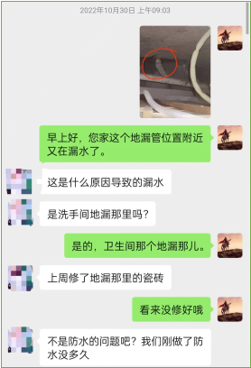 2022年8月李女士發(fā)現(xiàn)衛(wèi)生間頂棚漏水,管家李紅軍及時(shí)與樓上的業(yè)主協(xié)調(diào),業(yè)主短時(shí)間內(nèi)完成了漏水修補(bǔ)。然而兩個(gè)月后,李女士發(fā)現(xiàn)衛(wèi)生間頂棚又滴水了,經(jīng)查看,確認(rèn)是樓上地漏堵了,導(dǎo)致地漏管口邊滲水,管家李紅軍又與樓上的業(yè)主協(xié)調(diào),疏通了堵塞的地漏管,同時(shí)請(qǐng)業(yè)主對(duì)管口邊做防水,從而解決多次滲水問(wèn)題。